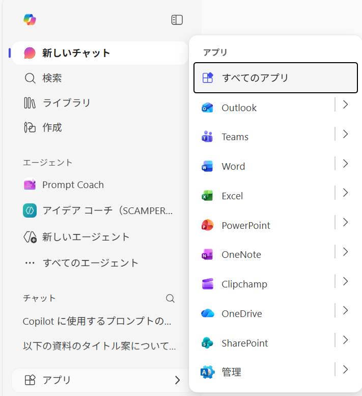 Microsoft 365 Copilot の画面を開く