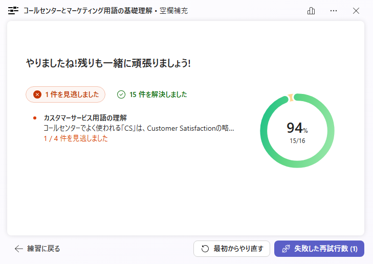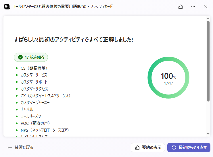 すべての単語学習が終わったら、結果が表示されます。