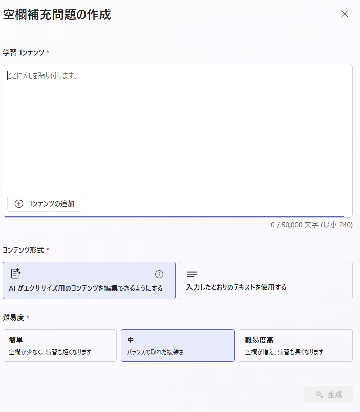 学習コンテンツから、穴埋め問題を作成する